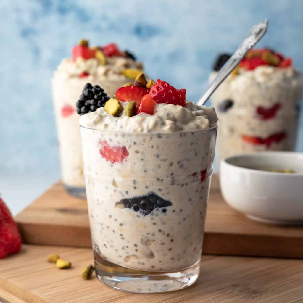 - In a jar, mix half a cup of oats with half a cup of Greek yogurt, half a cup of milk (or plant milk), and a scoop of protein powder.